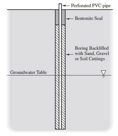 The location and condition of groundwater table are often determined through installing an observation well. The observation well is constructed by inserting a slotted PVC pipe in a completed boring, after that the boring is backfilled with a well-graded sand and gravel, see Figure 3.