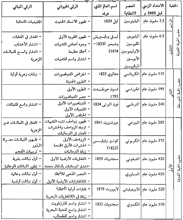 ويوضح الشكل (1-1) جدولاً يظهر الأحقاب الأربع والنظم التي تتشكل منها ووصف الأسماء الحيوانات والنباتات فيها.
