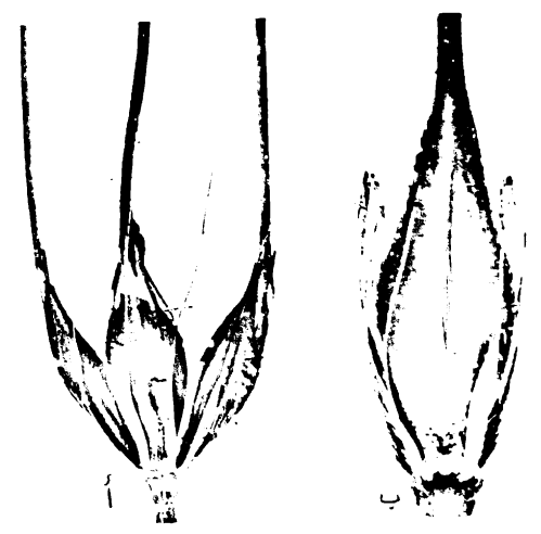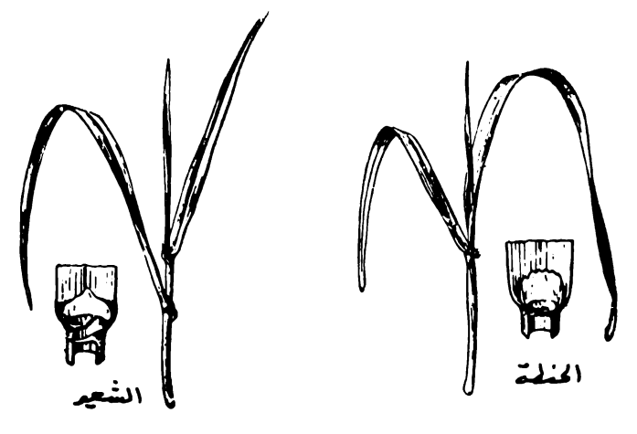 شكل ( 2 ) يبين شكل الاذينات في نباتي الحنطة والشعير ويلاحظ تأبط الاذينات الطويلة الملاء في اوراق الشعير في حين تكون أذينات اوراق الحنطة اقصر وينمو عليها الشعر.