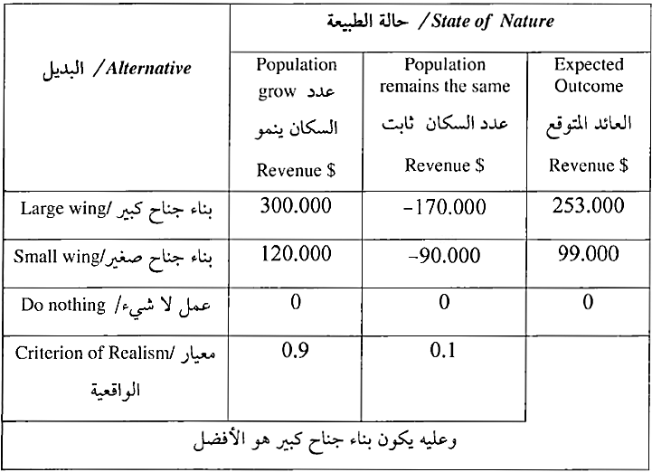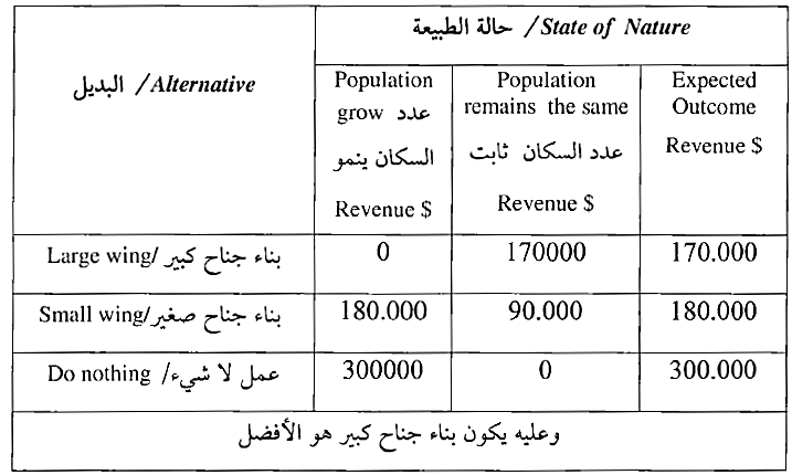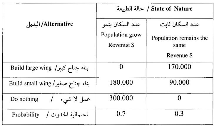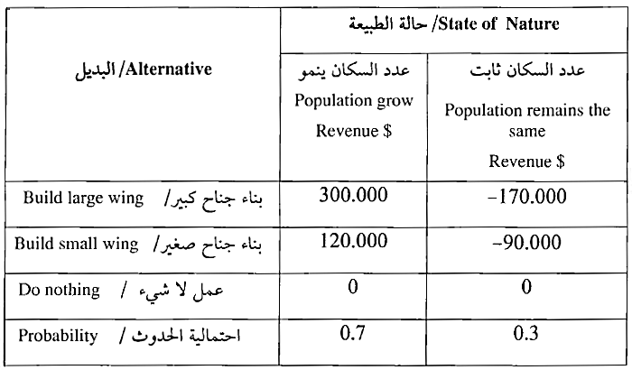 يحتاج أحد المستشفيات الخاصة إلى التوسع لمواكبة ازدياد الاقبال عليه، وكان أمامه خياران : إما أن يبني جناحا كبيرا أو أن يبني جناحا صغيرا . إذا استمر عدد سكان المدينة التي يقع فيها المستشفى بالازدياد فإن الجناح الكبير متوقع أن يحقق عائداً قدره 8 300.000 في السنة والجناح الصغير متوقع أن يحقق عائداً قدره 8 120.000 في السنة أما إذا بقي عدد سكان المدينة ثابتا فإن بناء الجناح الكبير سيؤدي إلى خسارة قدرها 5 170,000 أما الجناح الصغير فسيؤدي إلى خسارة قدرها 8 90.000. إذا علمت أن احتمال أن ينمو عدد سكان المدينة هو 0.7 وأن يبقى ثابتا هو 0.3 .