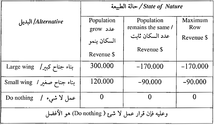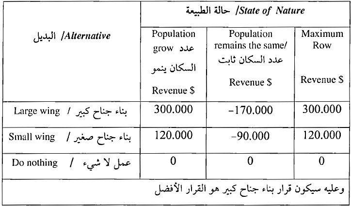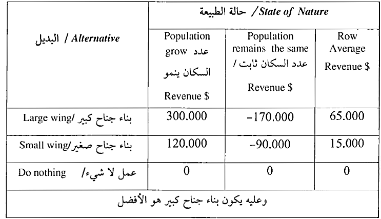 وبناء على النتائج يتم اختيار البديل الذي يحقق أقل خسارة متوقعة وهو البديل الأول (بناء جناح كبير) .