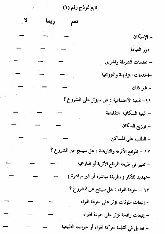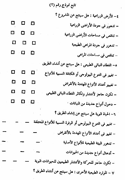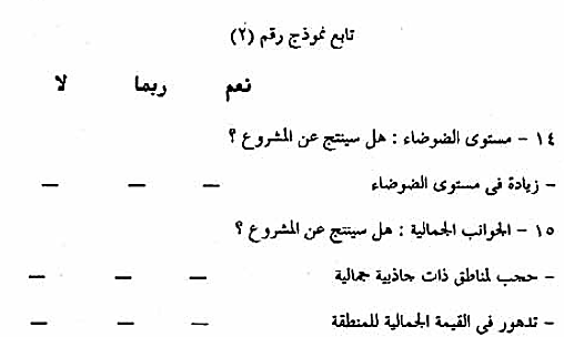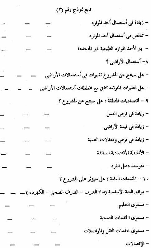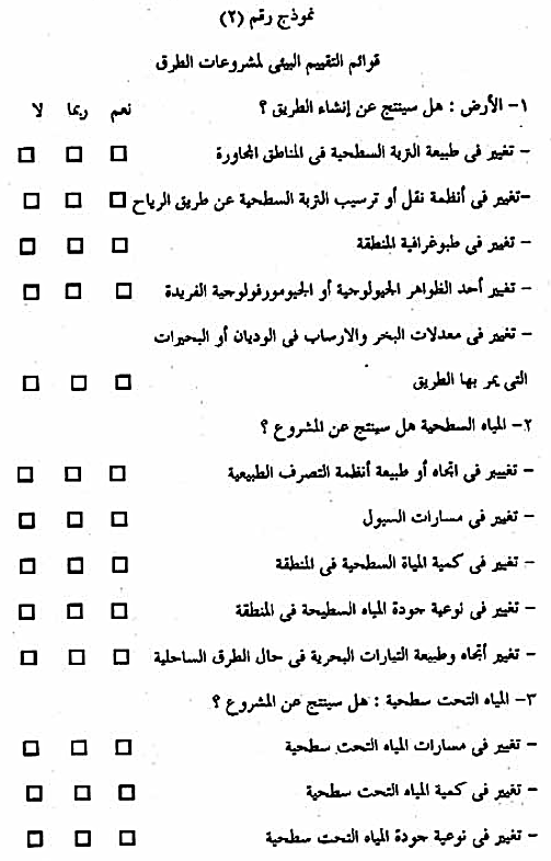 4-5-2-2- تحليل البيانات : يتم تحليل البيانات عن طريق قوائم التقييم البيئي ، نموذج (2) والتي تعتمد على النتائج التي تم جمعها في الخطوة السابقة مع مقارنتها بمكونات المشروع وأنشطته المتوقعة ، وتتضمن تحليل البيانات الإجابة على الأسئلة الواردة في هذه القوائم مع إعطاء تفسير للإجابات كلما أمكن ذلك . وينتج عن ذلك التحليل التعرف على جوانب المشروع التي يتوقع أن تكون لها أثار ضارة على أحد عناصر البيئة