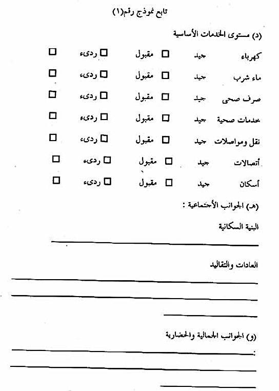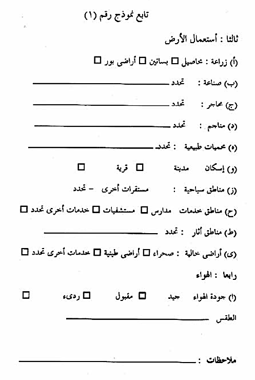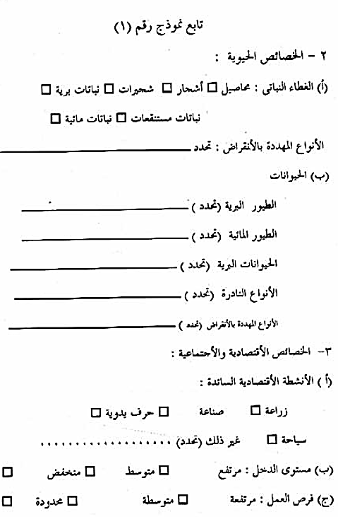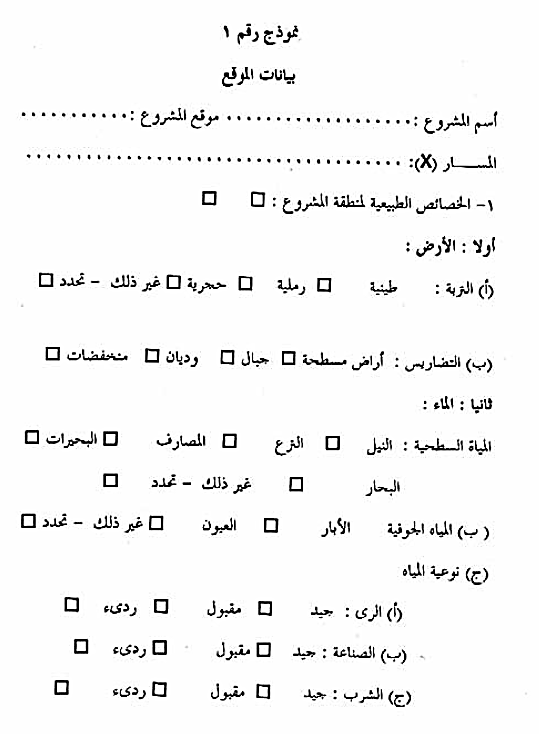 - القوانين والاشتراطات البيئية القومية والمحلية التي تخضع لها المشروعات . ويفضل جمع وتبويب تلك البيانات في نماذج خاصة معدة لذلك، يوضح نموذج رقم (1) مثالا لها