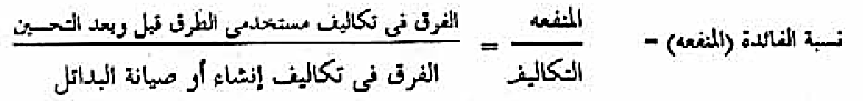 فإذا كانت نسبة الفائدة تساوى واحد يدل على أن نسبة الوفر في التكاليف السنوية المستخدم الطريق تساوى تكلفة تحسين وصيانة الطريق . وتتم مقارنة نسبة الفوائد للبدائل المختلفة وذلك باختيار أعلى نسبة فائدة تزيد عن واحد وتستخدم المعادلة العامة التالية لحساب نسبة الفائدة :