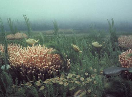 Marine life from the Cambrian period. Virtually all of the modern invertebrate groups made their first definitive appearance in the early Cambrian period.
