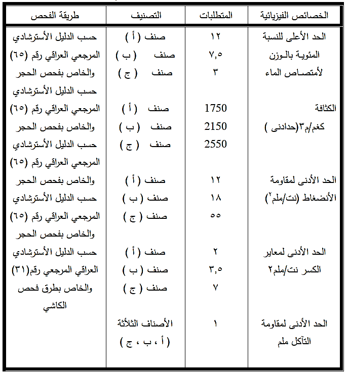 يطابق الحجر الرملي المتطلبات الواردة في المواصفة القياسية رقم (1387/1989) وكما مبين في الجدول رقم (5-13)