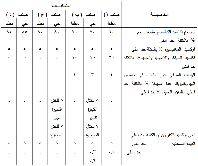 المتطلبات الكيميائية لأصناف الجير