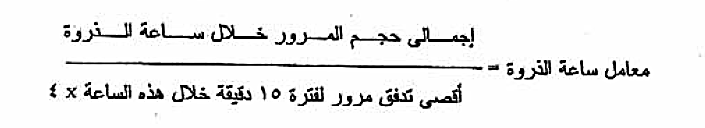 ويعرف تدفق المرور (Traffic Flow ) بأنه المعدل المكافئ في الساعة لمرور المركبات عند نقطة معينة أو قطاع من الطريق خلال فترة زمنية أقل من ساعة ، وتسمى النسبة بين حجم المرور خلال ساعة الذروة وأقصى تدفق مرور لفترة 15 دقيقة خلال هذه الساعة باسم معامل ساعة الذروة Peak Hour Factor أو ( .P.H.F ) والذي يمكن حسابه من المعادلة الآتية :