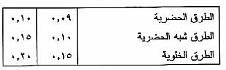وبالنسبة للطرق ذات الحارتين فإن قيمة المعامل تتراوح بين 0.10 إلى 0.15