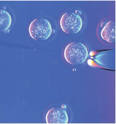 A micro injection of foreign genes into animal cells. Similar techniques are used to insert an entire nucleus into a host egg cell.