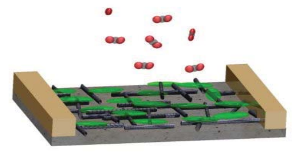 والشكل رقم (33) يمثل صورة مبسطة لمبدأ عمل الجهاز، وهو يتكون من شبكة من الأنابيب الدقيقة المصنوعة من ذرات الكربون، ومغطاة بطبقة من مادة عضوية، وهذا المزيج يتفاعل تلقائيا مع ثاني أكسيد الكربون الذي يفرزه الإنسان عند التنفس. وهكذا يمكن مراقبة تنفس المريض عن طريق قياس تركيز ثاني أكسيد الكربون الذي يفرزه المريض.