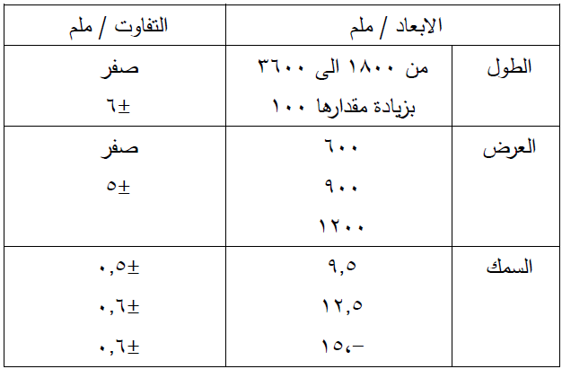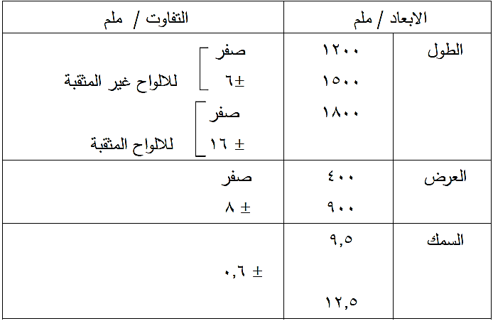 تكون أبعاد وتفاوتات الألواح الجبسية الجدارية وفق المواصفة القياسية العراقية رقم 1676 وكما مبين في الجدول رقم (11-4) .