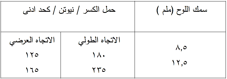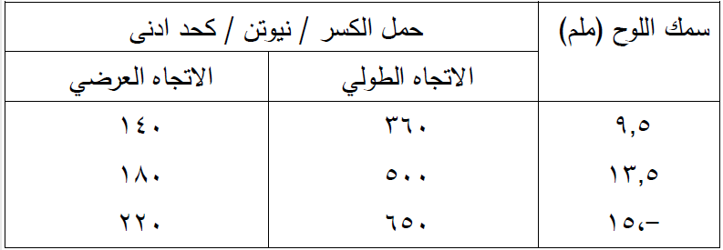 لا يقل معدل حمل الكسر لخمسة عينات فحص مستطيلة الشكل ابعادها 400 ملم × 300 ملم عند فحصها وفق المواصفة القياسية العراقية رقم 1676 عن القيم الواردة في الجدول رقم (11-5) ولا تقل اية قيمة فردية عن 10% من المعدل ادناه .