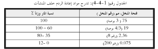 يجب ان تكون المواد المستخدمة في الردم خلف المنشآت مثل دعائم الجسور واجنحة العبارات والجدران الاستنادية من المواد المختارة التي لا تتأثر بالمياه وحرة التصريف، وخالية من المواد العضوية القابلة للتحلل كما يجب الا تزيد نسبة املاح الكبريتات والكربونات فيها على نصف 0.5 بالمائة من وزن المادة حسب اختبار 291 AASHTO T 290/T، ويجب الا تحتوي على عناصر صخرية يزيد مقاسها الاقصى على ثمانية ( 8 ) سنتيمترات، ويجب الا يقل تصنيف تلك المواد عن 4-2- والا يزيد مؤشر لدونتها على خمسة (5) عند اختبارها وفق اختبار 90 AASHTO T. يجب ان تحقق المواد الركامية المستخدمة في اعادة الردم خلف المنشآت التدرج المبين في الجدول رقم (1-4-2) ، او اي تدرج اخر تنص عليه المواصفات الخاصة.