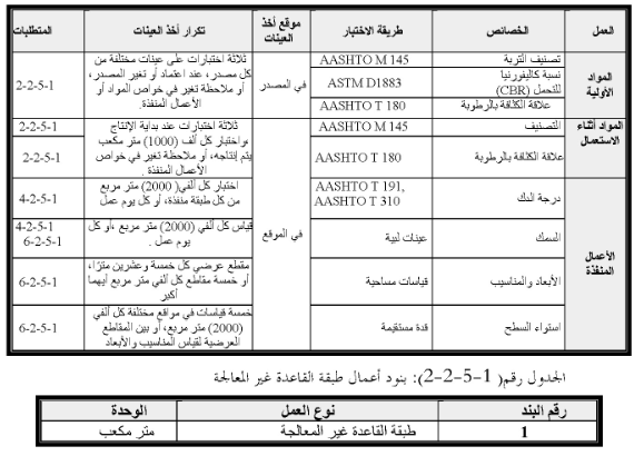 يحق للوزارة في اي وقت التاكد من جودة المواد والاعمال المنفذة بالقيام او الامر بالقيام تحت اشرافها المباشر باختبار مواد طبقة القاعدة غير المعالجة، وفحص العمل المنفذ لكل او بعض بنود ضبط الجودة المحددة في الجدول رقم (1-2-5-1) من هذه الفقرة.