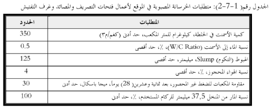 عند تنفيذ غرف التفتيش والمصائد وفتحات التصريف من الخرسانة الاسمنتية المصبوبة في الموقع، فان هذه الخرسانة يجب ان تتكون من خليط الركام والاسمنت البورتلاندي المقاوم للكبريتات ويجب ان تحقق المتطلبات المبينة في الجدول رقم (2-7-1)، ما لم تنص المواصفات الخاصة على خلاف ذلك.
