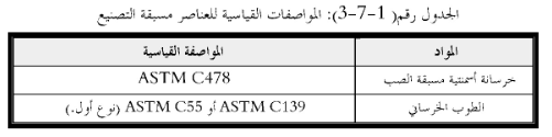 اما عند استخدام العناصر مسبقة التصنيع، فيجب ان تحقق متطلبات المواصفات القياسية المبينة في الجدول رقم (3-7-1) حسب المواد.