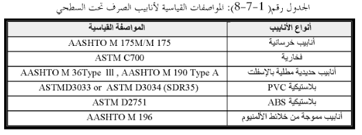 يمكن تنفيذ اعمال شبكة التصريف تحت السطحية باستخدام الانابيب الخرسانية او الفخارية او الحديدية او البلاستيكية PVC او من خلائط الالمنيوم، ويجب ان تكون تلك الانابيب مثقبة مسبقا، او يمكن استخدام وصلات تسمح بمرور المياه للسماح للمياه بالدخول الى الانابيب، حسب ما تنص عليها لمواصفات الخاصة والمخططات، ويجب ان تكون تلك الانابيب مطابقة لمتطلبات المواصفات القياسية المبينة في الجدول رقم ( 1-7-8)، ما لم تنص المواصفات الخاصة على خلاف ذلك.