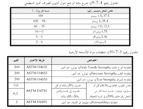 ، وما لم تنص المواصفات الخاصة على تدرج محدد لمادة طبقة المرشح، يمكن الاسترشاد بالتدرج المبين في الجدول رقــــم (9-7-1)، مع ضرورة التحقق منه على اساس العلاقات المذكورة وبمعلومية تدرج التربة المحيطة وشكل وابعاد ثقوب الانابيب.
