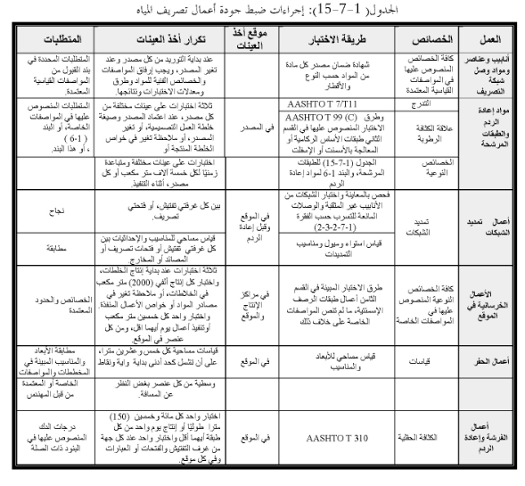 يحق لصاحب العمل في اي وقت التاكد من جودة المواد والاعمال المنفذة بالقيام او الامر بالقيام تحت اشرافها المباشر باختبار مواد اعمال تصريف المياه وفحص العمل المنفذ لكل او بعض بنود ضبط الجودة المحددة في الجدول (15-7-1) من هذه الفقرة.