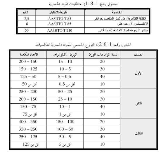 يجب ان تكون المواد الحجرية المستخدمة لتكسية وحماية المنحدرات من الصخور الصلبة المقاومة للعوامل الجوية والمياه وان تكون خالية من التشققات ومن المواد الطينية والمواد الاخرى القابلة للتحلل والمواد الضعيفة، ويجب، ما لم تنص المواصفات الخاصة على خلاف ذلك، ان تحقق المتطلبات النوعية المبينة في الجدول رقم (1-8-1)، كما : تحقق مواد التكسية الحجرية المفككة او المربوطة بالمونة متطلبات التوزع الحجمي المبينة في المواصفات الخاصة و وثائق العقد او احد التوزيعات المبينة في الجدول رقم (1-8-2)، ويجب الا يقل البعد الاصغر للحجر عن 20سم او ثلث (1/3) بعده الاقصى ايهما اكبر ، يجب ان تكون المواد من الحجارة ذات الزوايا لتامين الاحتكاك الكافي بين الأحجار.