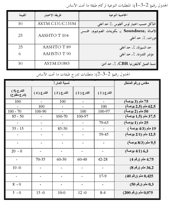 يجب ان يستخدم في تنفيذ طبقة ما تحت الاساس المواد الركامية المطابقة لمتطلبات التدرج والمتطلبات النوعية المبينة في المواصفات الخاصة او في هذه المواصفات العامة.