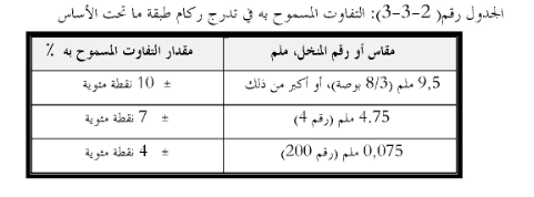 يجب ان تحقق المواد الركامية متطلبات الجودة الواردة في الجدول رقم (2-1) ما لم تنص المواصفات الخاصة على خلاف ذلك، كما يجب ان تحقق المواد الركامية بعد خلطها احد التدرجات المبينة في الجدول رقم (2-3-2) او اي تدرج اخر تنص عليه المواصفات الخاصة ضمن حدود التفاوت، عن صيغة العمل التصميمية المعتمدة المسموح بها المبينة في الجدول رقم ( 2-3-3).