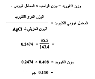 الحسابات في المثالين متشابهة . وفي كلاهما يعطي وزن مادة واحدة بواسطة الناتج الذي يتضمن وزناً معلوماً لمادة أخري والنسبة التي تحتوي على أوزان الصيغة الوضعية الجرامية . أن هذه النسب هي العامل الوزني . وفي المثال الثاني من الضروري أن يضرب وزن الصيغة الوضعية الجرامية لكلوريد الفضة بـ 3 وذلك لكي يتم موازنة عدد الكلوريد الذي يظهر في البسط والمقام للمعامل الوزني .