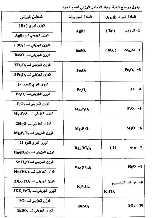 1- إن المعامل الوزني يجب أن يحتوي على الصيغة الكيميائية للمادة المراد تقديرها في البسط والصيغة الكيميائية للمادة المعلومة في المقام .