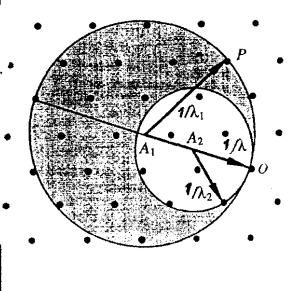 وحيث إن الشبيكة العكسية التخيلية تُرسم نقاطها على أبعاد k/d فإنه إذا كانت k وهي الكمية الثابتة تساوd الواحد الصحيح فإن دائرة الانعكاس في هذه الحالة يكون نصف قطرها 1/λ وبذلك فإن الدائرتين المبينتين في الشكل ذوات الأقطار 1/λ1، 1/λ2 هما دائرتي الانعكاس لحدود طولي الموجة المستخدمين وتكون المستويات التي تمثلها نقاط الشبيكة البلورية العكسية المحصورة بين محيطي الدائرتين هي المستويات التي تحقق قانون براج وهي التي يمكن أن تعطي انعكاسات.