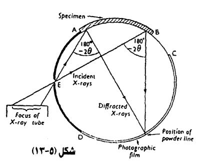 كل الزوايا المحيطة على سطح دائرة وعلى نفس القوس تكون متساوية وتساوي نصف الزاوية المركزية المقامة على نفس القوس، فإذا افترضنا أن الأشعة المنعكسة بواسطة المستوى hk l تحدث من كل نقطة على العينة الموضوعة على القوس AB وأن الأشعة الساقطة على العينة تأخذ الاتجاهات المحددة بالاتجاهين EB, EA فبالتالي الأشعة المنعكسة من النقطتين A, B سوف تنحرف بزاوية θ2 ولكن كل من زاويتي الانحراف θ2 تساوي كل منهما الأخرى، الذي يعني أن الأشعة المنعكسة سوف تأخذ الاتجاهات وتلتقي في البؤرة على الفيلم الذي يوضع على سطح الدائرة، وهذه الطريقة تزيد من شدة الأشعة المنعكسة وذلك يقلل من زمن تعرض الفيلم للأشعة وهو المطلوب عمليا.