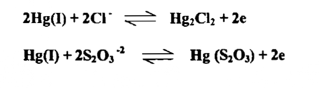 أن بعض الأيونات السالبة اللاعضوية التي تكون معقدات او رواســـب مــــع أيونات الزئبق تكون مسئولة عن الموجات الانتقائية التي تحدث في منطقة صفر فولت وهنا يتضمن تفاعل القطب عملية تأكسد مثل :
