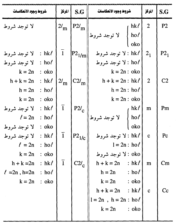 مثال:الجدول الآتي يحتوي على المجموعات الفراغية للنظام أحادي الميل Monoclinic والانعكاسات الموجودة في كل مجموعة.
