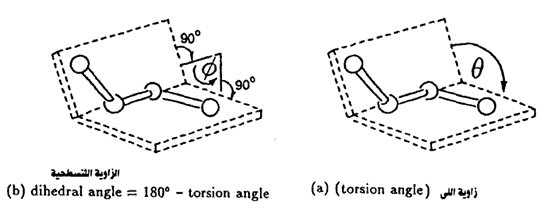 إذا أردنا معرفة وضع أو ميل جزيئين أو أكثر بالنسبة لبعضهما البعض فإن الطريقة هي حساب الزاوية بين سطحين يمكن تحديدهما بواسطة بعض الذرات التي تمر بهما. وتعرف الزاوية الثنسطحية بين سطحين على أنها الزاوية بين العمودين على هاتين السطحين (شكل 9-8).