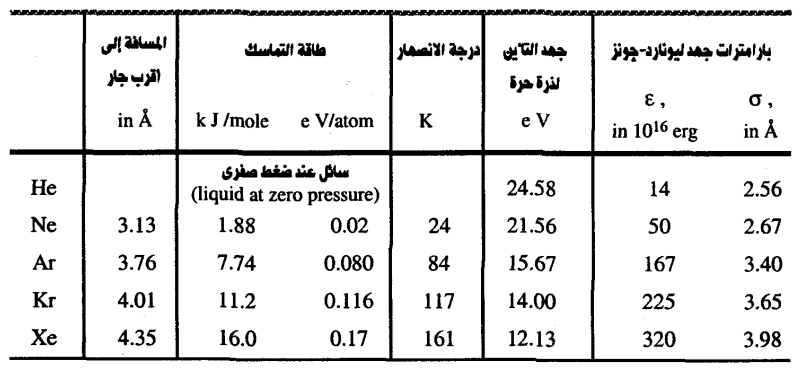 تعتبر بلورات الغازات الخاملة من أبسط أنواع البلورات المعروفة ويلخص الجدول (1-2) خواص تلك البلورات عند درجة حرارة الصفر المطلق. وهي بلورات شفافة وعازلة وروابطها واهية، كما أن درجات انصهارها منخفضة للغاية. وتتكون من ذرات ذات طاقات تأين مرتفعة جدا.