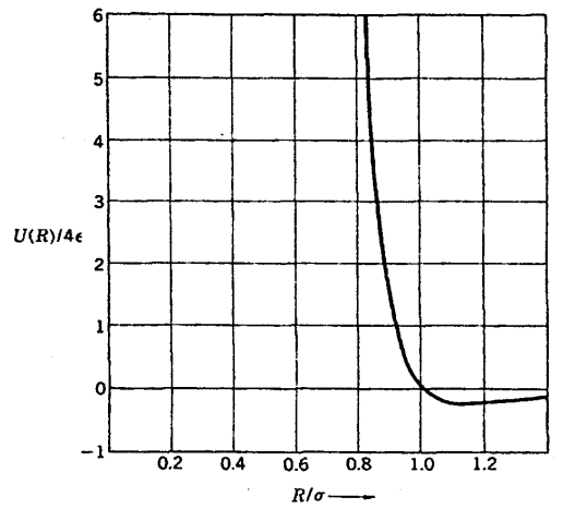 تمثيل بياني لجهد لينارد جونز (المعادلة 3-9) والذي يصف التفاعل بين ذرتي غاز خامل