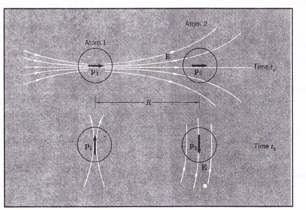 (انظر الشكل 3-9) عند مركز الذرة الثانية التي تبعد مسافة مقدارها R عن الذرة الأولى، وهذا المجال نفسه ينشئ عزم ثنائي القطب لحظيا هو