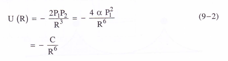 حيث C مقدار ثابت. وتشير الإشارة السالبة إلى أن التفاعل بينهما من النوع التجاذبي ويسمى تفاعل «فان درفال» أو تفاعل «لندن» أو تفاعل ثنائي قطب مع ثنائي قطب مستحث. وهذا هو التفاعل التجاذبي الأساسي في بلورات الغازات الخاملة وبلورات العديد من المواد العضوية.