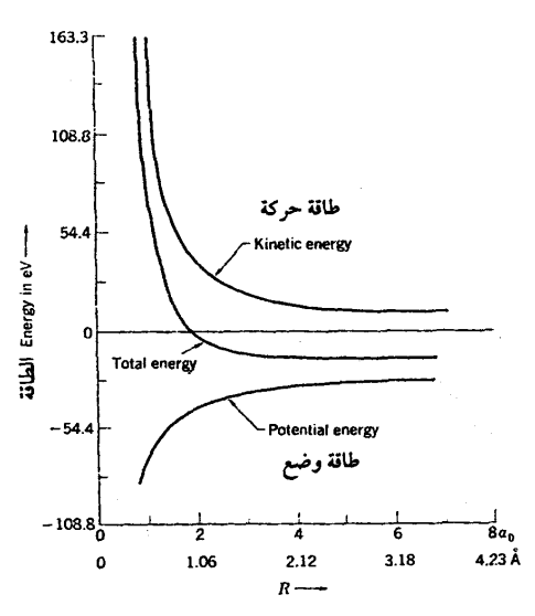 طاقة الحركة وطاقة الوضع والطاقة الكلية لذرة هيدروجين داخل حيز کروي جامد نصف قطره R. تزداد الطاقة الكلية كلما قل نصف قطر الحيز