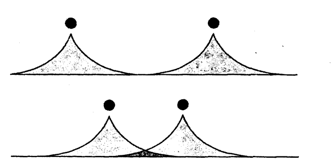 يتراكب توزيع الشحنة لكل من الذرتين عند اقترابهما من بعضهما البعض. وتشير الدوائر المصمتة إلى النوى.