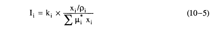 حيث تعتمد ki على المكون i وكذلك على هندسة الجهاز، fi هي النسبة الحجمية للمكون i، μ هي معامل الامتصاص للخليط. وإذا كانت xi هي النسبة الوزنية، ρi  هي كثافة المكون i فإنه يمكن كتابة المعادلة كالآتي: