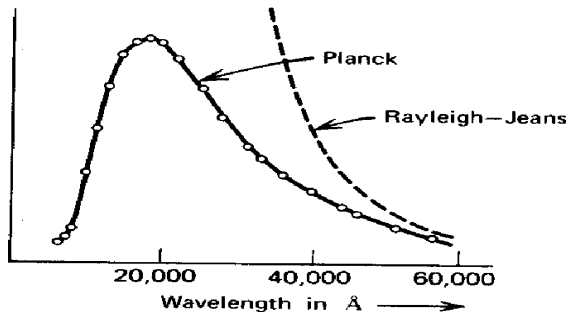 مقارنة بين قانون بلانك ورايلي – جينز النتائج التجريبية (النقاط) تتفق بشكل مثير مع قانون بلانك.
