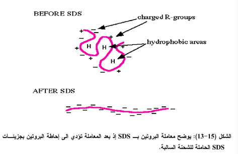 ب- ان مادة SDS تعمل على تفكيك البروتين معطياً سلاسل متغيرة الأحجام محاطة بجزيئات SDS ذات الشحنة السالبة الشكل (15-13) وتتحرك هذه السلاسل بالهجرة الكهربائية معتمدة على الأوزان الجزيئية للسلاسل الببتيدية فقط.
