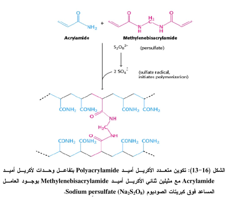 ج- متعدد الأكريل أميد Polyacrylamide : ان متعدد الأكريل أميد المستخدم في تقنية الهجرة الكهربائية يتكون من بلمرة الوحدات الأحادية للأكريل أميد وثنائي الأكريل أميد Bisacrylamide بوصفه رابطاً جسرياً Cross linker بوجود العامل المساعد فوق كبريتات الصوديوم Sodium persulfate أو رايبوفلافين لتكـوين الجذور الحرة وربـاعي مثيل اثيل ثنـائي الأمـين البلمرة (Tetramethyl ethylene diamine (TEMED الشكل (16-13) الذي يساعد في عملي وتكوين بوليمر هلامي ذي تأصر جسري بأحجام مختلفة اعتماداً على تركيز الأكريل أميـد. ان عمليــة البلمرة تكون بطيئة أو تتوقف بوجود الأوكسجين فيفضل التفريغ من الغازات Degassing حين إجراء عملية البلمرة.