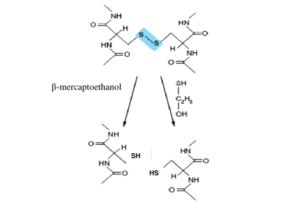 أ- يعامل البروتين أولاً مع المركبات التي تحتوي على مجموعة الثايول (SH-) مثل بيتا- مركبتوإيثانول -mercaptoethanol β أو داي ثايو ثريتول Dithiothreitol لتكسير الأواصر ثنائية الكبريتيد الموجودة في البروتين وتحويلها الى الشكل المختزل كما في المعادلة الآتية: