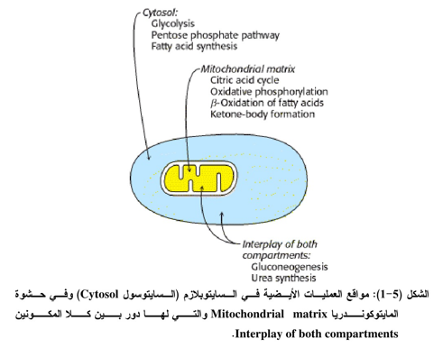 1- تخصص مواقع العمليات الايضية Compartmentalization: إن لكل عملية أيضية موقعاً تتحدد فيه عملها فمثلاً مسار الكلايكولسيس ومسار الفوسفوكلوكونيت وبناء الأحماض الدهنية تحدث فــــي السايتوبلازم بينما عمليات تقويض الأحماض الدهنية ودورة كربس والفسفرة التأكسدية وتكوين أجسام كيتون تحدث في المايتوكوندريا. وهناك عمليات مشتركة في الموقعين (السايتوبلازم والمايتوكوندريا) مثل بناء اليوريا أو بناء الكلوكوز ( مسار الكلوكونيو جنزيس) (الشكل 5-1).