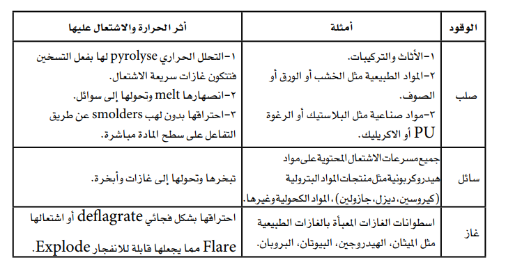 هي مواد كيميائية لها القدرة على التفاعل مع المواد المؤكسدة عن توفر مصدر مناسب للاشتعال وهي إما مواد عضوية كالمواد البترولية ( جازولين أو كيروسين أو ديزل ) والخشب والصوف أو مواد غير عضوية مثل الفسفور والكبريت كما يمكن أن تتواجد المواد القابلة للاحتراق في جميع حالات المادة الثلاث ( الصلبة – السائلة الغازية ) ويوضح الجدول (2-1) أمثلة على بعض أنواعها وأثر الحرارة والاشتعال عليها :