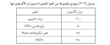 كما يلاحظ فإن ميزان الاكسجين سلبي، وهذا يجعل النظام ضعيفاً، وبالتالي يحتاج لمقدار إضافي من الأكسجين من مصدر خارجي، ويوضح الجدول (3-3) مجموعة لأهم المتفجرات وميزان الأكسجين لها) 1 (.