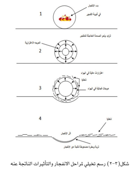 ويوضح الشكل (3-2) التأثيرات المختلفة الناتجة من الموجة المفاجئة التي تهز الموقع المحيط بالمتفجر، وتنطلق منه الشظايا بعيدا عن موقع التفجير كما تقوم الغازات الحارة المتمددة في أحداث فتحة في الأرض .