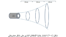 ويوضح الشكل التالي كيفية خروج الطلقة ومخلفاتها والتي تكون في شكل مخروطي من فوهة السلاح وطريقة انتشارها حسب تركيبها ووزنها .